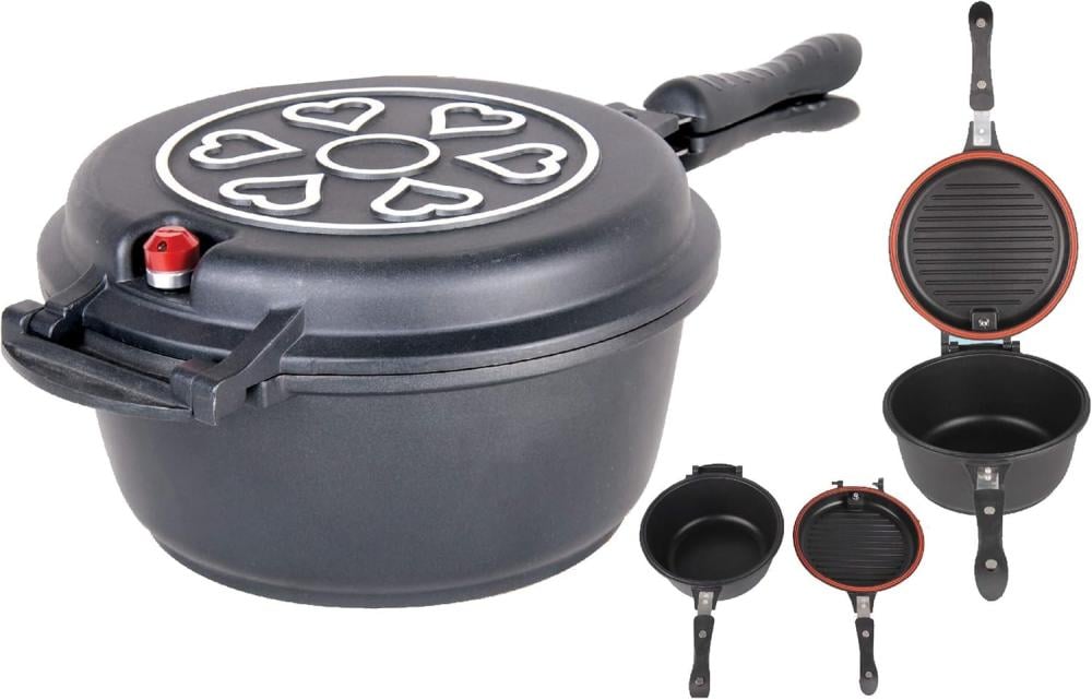 - التصميم: وجهين (مقلاة جريل + قدر عميق) مع يد عازلة للحرارة
